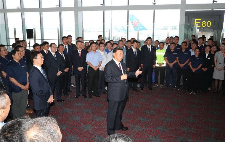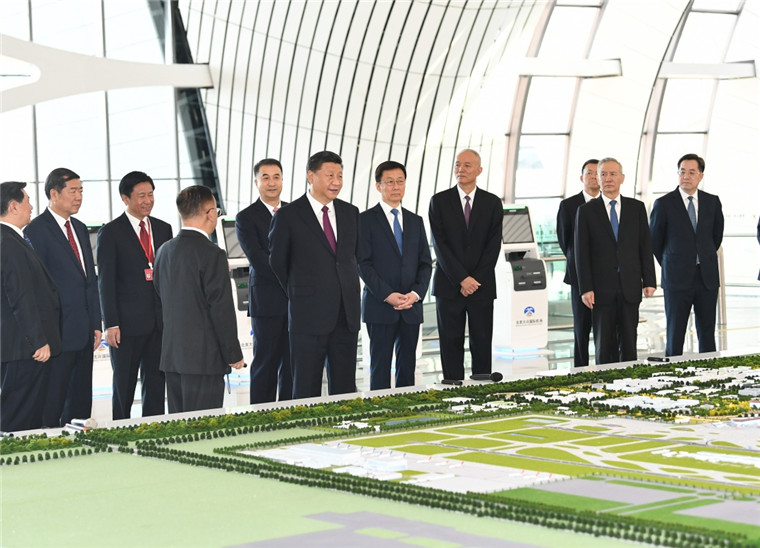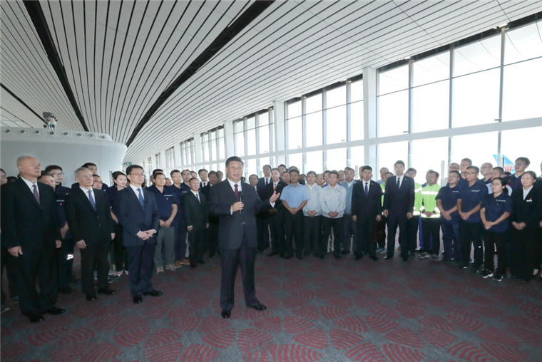 大兴机场航站楼,是目前全球最大规模的单体航站楼,以其独特的造型设计、精湛的施工工艺、便捷的交通组织、先进的技术应用,创造了许多世界之最。航站楼里,流线型的空间结构十分宽敞明亮。习近平步行巡览站台大厅和值机大厅,实地了解值机、安检、登机和残疾人无障碍设施等情况,并结合沙盘和模型听取机场总体规划、设施建设等介绍。习近平强调,大兴国际机场是首都的重大标志性工程,是推动京津冀协同发展的骨干工程。京津冀三地要抓住机遇加强协同合作,加快推动地区高质量发展。民航业是国家重要的战略产业。要建设更多更先进的航空枢纽、更完善的综合交通运输系统,加快建设交通强国。