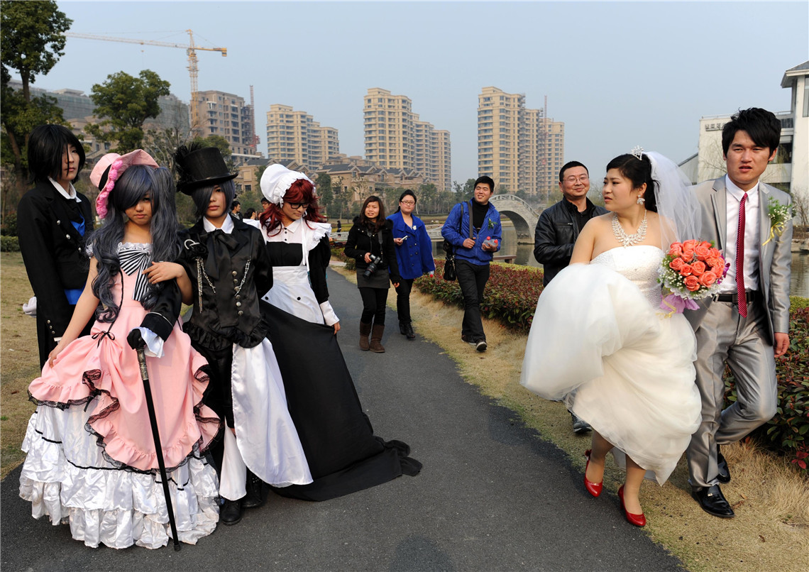 2011:浙江嘉兴,凌公塘公园,一群年轻人身着艳丽的“二次元”服装与一对拍摄婚纱照的新人擦肩而过。穿着像动漫角色一样夸张的服装,染着五颜六色的头发……在大多数人眼里,看起来有些稀奇古怪的二次元元素,成为当时一些年轻人的追求。