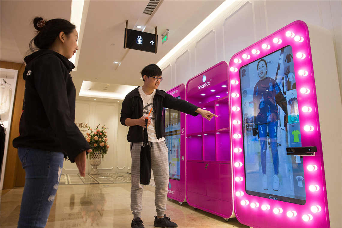 2017:江苏南京,顾客正在体验“虚拟试衣镜”,不用脱衣也能换装,高科技进入服装零售业。
