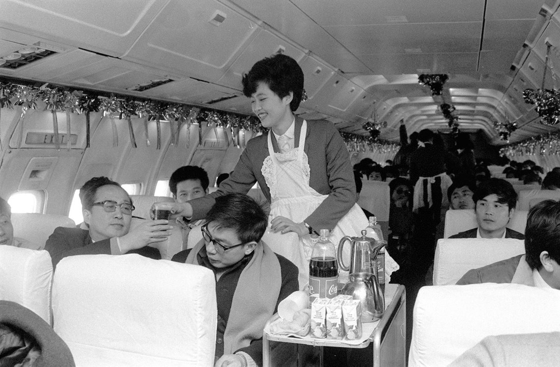1987:中国第一家地方国营航空公司——上海航空公司,空乘人员在上海飞往北京的航班上为乘客服务。