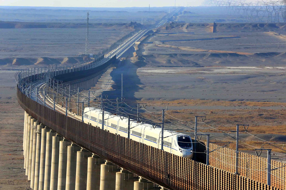 2014:新疆,一列动车从兰新高铁哈密淀泉特大桥上驶过。兰新高铁是世界上第一条高原高铁。