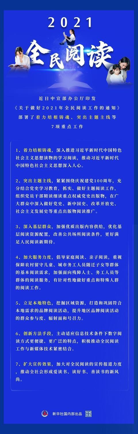 通知部署了2021年全民阅读重点工作:着力培根铸魂,深入推进习近平新时代中国特色社会主义思想读物的学习阅读,推动习近平新时代中国特色社会主义思想深入人心。突出主题主线,紧紧围绕庆祝建党100周年,充分结合党史学习教育,抓实、做好主题阅读工作,组织党员干部精读细读重点权威党史出版物,在广大群众中深入做好党史、新中国史、改革开放史、社会主义发展史等重点出版物阅读推广。深入基层群众,加强优质出版内容供给,优化基层阅读资源配置,改善公共场所阅读条件,更好满足人民阅读新期待。加大服务力度,倡导家庭阅读、亲子阅读,重视保障农村留守儿童、城市务工人员随迁子女等群体的基本阅读需求,加强面向残障人士、务工人员等群体的阅读服务,有针对性地做好重点和特殊人群的阅读工作。立足本地特色,挖掘区域资源,打造和巩固符合本地需求的品牌阅读活动,提升地区品牌阅读活动的群众参与度、辐射面和号召力。创新方法手段,主动适应信息技术条件下数字阅读方式更便捷、更广泛的特点,积极推动全民阅读工作与新媒体技术紧密结合。扩大宣传效果,加大对全民阅读的宣传报道力度,推动全社会形成爱读书、读好书、善读书的新风尚。