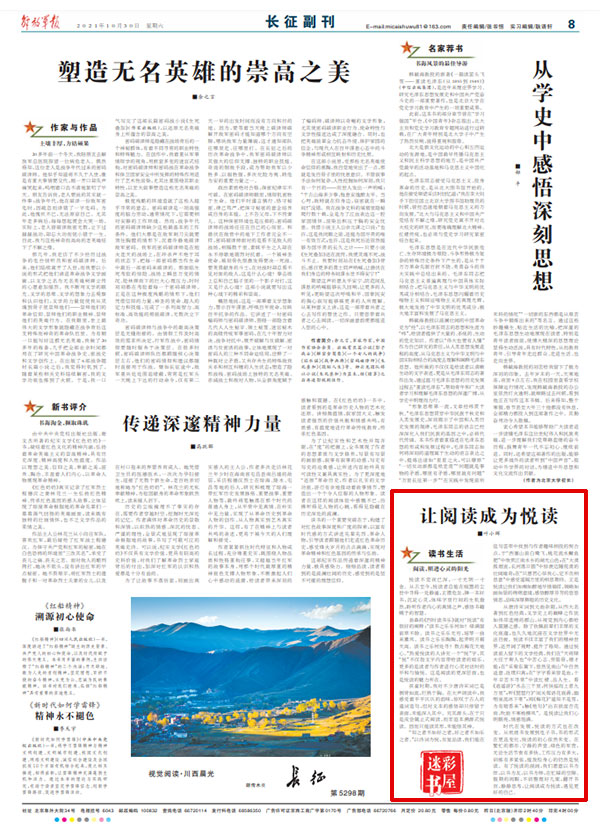 时代在发展,悦读的方式也在改变。从纸质书发展到电子书,书的形式在更迭变化,悦读的初心依然未变。在繁忙的都市、宁静的弄堂、绿色的军营,无论生活节奏有多快、工作压力有多大,训练有多紧张,能放松身心的仍然是悦读。有了悦读的浸润,我们愿意以书为伴,以书为友,以书为师,在忙碌的空隙、假期的闲暇,不妨整理好几案,翻开书页,静静思考,让阅读成为悦读,遇见更好的自己。