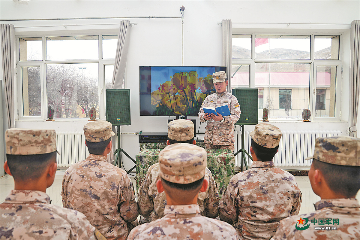 ▲连队读书分享会上,各兴趣小组轮流派代表上台发言,分享本周读书心得。 王静摄