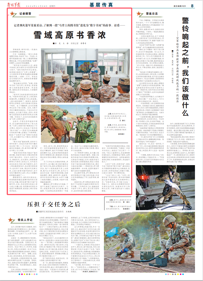 “从这个意义上说,‘马背上的图书馆’并没有消失,图书依旧随着战马滋养着连队官兵的精神和心灵。”刘指导员说,学习能力也是一种战斗力。连队官兵将赓续传承好先辈优良作风,加强知识学习和转化应用,不断为连队战斗力建设赋能。