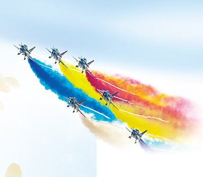 书里有人民空军飞行员开启飞行生涯的起点机型初教—6,也有20世纪八九十年代担负国土防空重任的歼—7和歼—8,还有新时代人民空军新质战斗力的代表——歼—20、歼—35A、歼—16和歼—10C。读者可以看到大型运输机运—20的不同身姿,比如在航展上的大角度俯冲着陆,在巍巍雪山上空进行的空中加油,在空军航空开放活动上耀眼的干扰弹,还可以看到歼击机、轰炸机、运输机、教练机、预警机、直升机,以及闻名遐迩的空军八一飞行表演队(上图)、空军航空大学“红鹰”飞行表演队和“天之翼”飞行表演队。镜头下的它们,共同编织出了一幅中国空军跨越式发展的壮阔图景。
