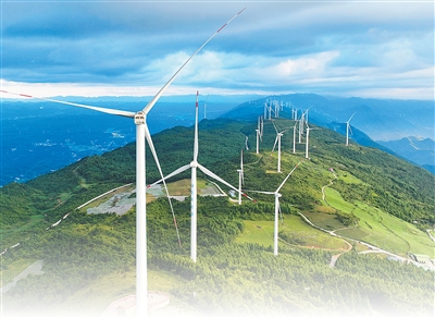 ▲6月27日,重庆万州区普子乡七曜村,一台台风力发电机矗立在连绵的群山上。 陈碧生摄(人民视觉)