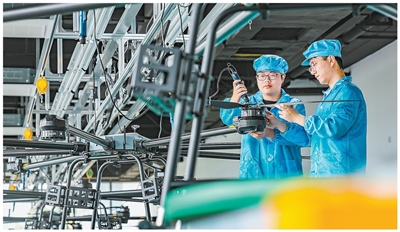▲7月30日,在安徽马鞍山市花山区东华云计算产业园,安徽泓景无人机科技有限公司无人机装配调试人员对无人机进行总装总调。 王文生摄(人民视觉)