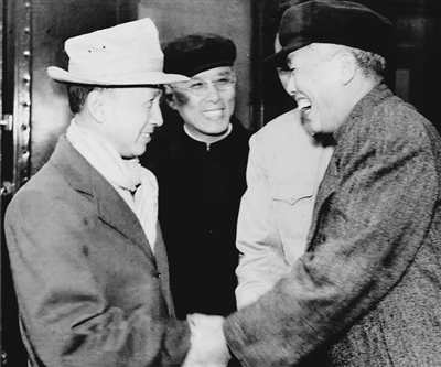 ▲钱学森(左一)抵达北京时,与前来迎接的中国科学院时任副院长吴有训(右一)亲切握手。 中共党史出版社提供