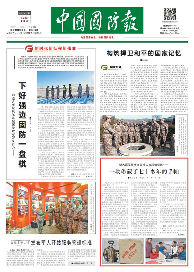 小小手帕,捧在手里重千钧。这块被岁月浸染发黄的手帕,是祝江波父亲祝志敏在抗美援朝战场上用过的。第十批在韩中国人民志愿军烈士遗骸回国那天,作为烈士家属代表,祝江波捧着这块手帕迎接志愿军英烈回家。“等了几十年,他们终于回来了。看到他们,就像看到父亲一样!”当礼兵捧着烈士遗骸棺椁走下飞机时,祝江波的眼泪夺眶而出。她紧紧攥着手帕,仿佛父亲回到了身边。