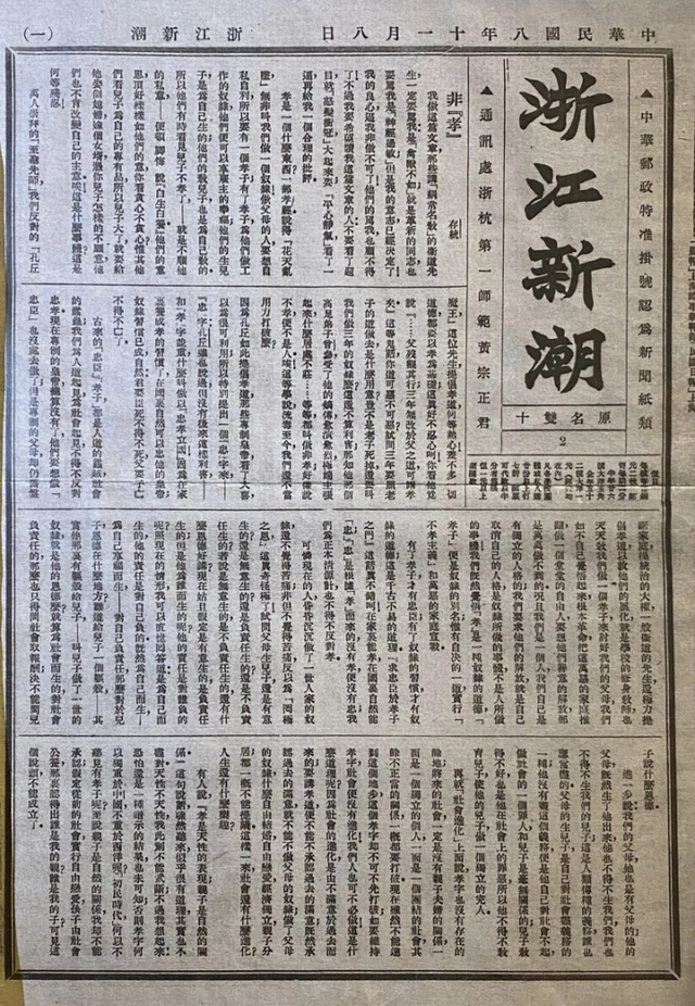 刊于1919年11月8日《浙江新潮》的施存统文章《非孝》。