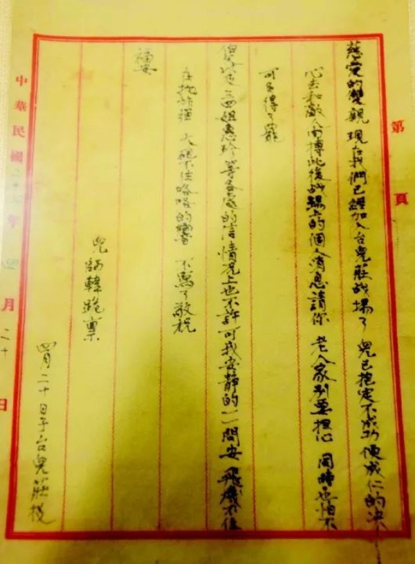 赵继昌借着战场的火光看着这封信:“慈爱的双亲:现在我们已经加入台儿庄战场了。儿已抱定不成功便成仁的决心,去和敌人肉搏。此后战场上的消息请您老人家不要担心,同时亦怕不可多得了。伯父以及三、四姐、惠珍等各处的信,情况上也不许可我安静地一一问安。飞机不住在抛炸弹,大炮不住在咚咚的响。不写了,敬祝福安。不肖儿师韩(赵克又名师韩)跪禀,四月二十日于台儿庄投。”