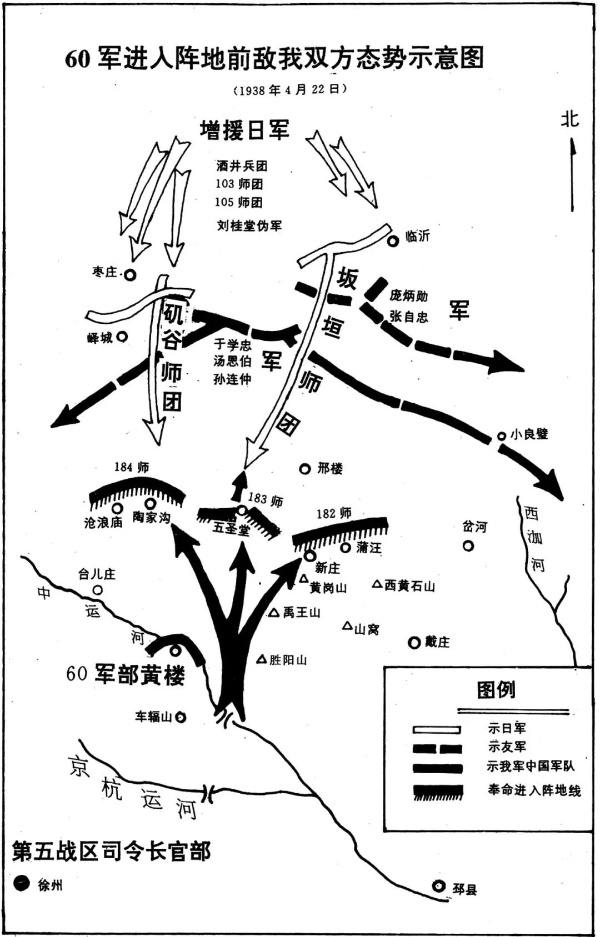 1938年4月22日上午,60军先头部队183师在车辐山车站下火车后,即通过运河浮桥,向东庄、邢楼、五圣堂方向前进。在行军中,突然和日军遭遇,发生了激烈的战斗。据赵继昌回忆:“敌人的炮弹如下雨一样打来,当时虽然情况不明,但我军士气非常旺盛,毫不畏惧地继续前进。那天是我们183师当前卫,首当其冲,所以损失特别大。”