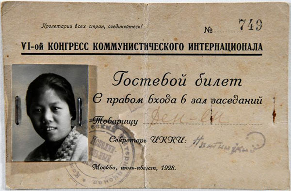 “这是一个长方形的纸质证件,俄文印刷的,上面印有‘全世界无产者联合起来’‘共产国际第六次代表大会’,用订书钉固定了一张邓颖超同志的黑白照片,加盖有共产国际执委会的徽章。”李勤介绍说,这是1928年邓颖超参加共产国际六大的列席证。此行,邓颖超还有一个更重要的任务,陪同周恩来参加党的第六次全国代表大会。