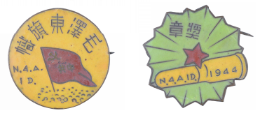 这是胡文杰20世纪40年代获得的纪念章和奖章。纪念章为铜质,上面印有“毛泽东旗帜”“N.4.A.1D”字样;奖章亦为铜质,上面印有“奖章”“N.4.A.1D 1944”字样。