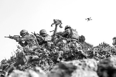 ▲武警广西总队河池支队特战队员利用无人机进行协同侦察。 蔡朝桂摄/光明图片