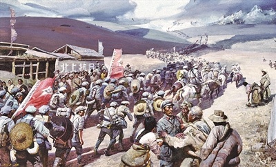▲油画《北上》创作于1996年,现藏于中国人民革命军事博物馆,描绘的是红2、红4方面军在四川甘孜地区胜利会师后,告别甘孜群众继续北上,为实现大会师向陕甘根据地进发的场景。