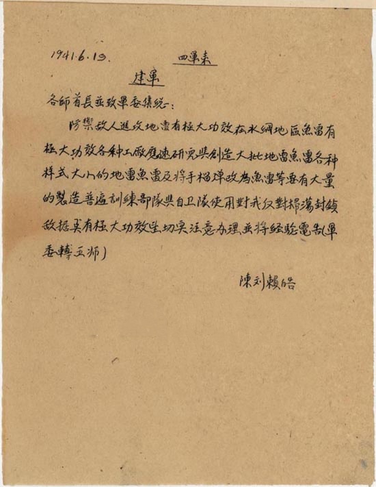 ▲1941年6月19日,陈毅、刘少奇、赖传珠“关于防止敌人进攻应速研究与制造大批地雷鱼雷”给新四军各师首长的电报。