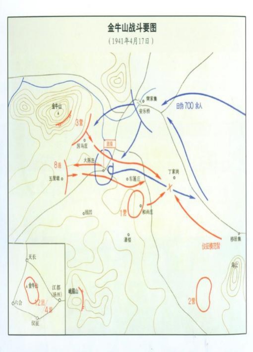 4月初,新四军第2师第4旅第12团(以下简称12团)经整训后开赴天长、仪征、扬州、六合一带,执行反“扫荡”斗争,巩固与发展淮南津浦路东抗日根据地,并保卫当地群众的夏收。按照党委指示和师部部署,12团主动出击,连续作战,对盘踞在谢家集、甘泉山、铁牌店和蚂蚁山一带的日伪军予以狠狠打击。在完成袭击敌人任务以后,12团奉命撤至金牛山一带宿营休整。