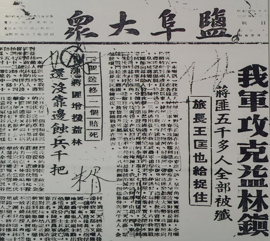 ▲1948年3月25日《盐阜大众》报道“我军攻克益林镇”。