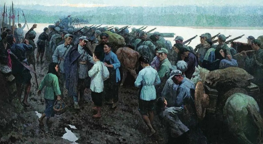 ▲反映中央红军从江西于都出发开始长征这一历史事件的油画《送别》(靳尚谊作)。
