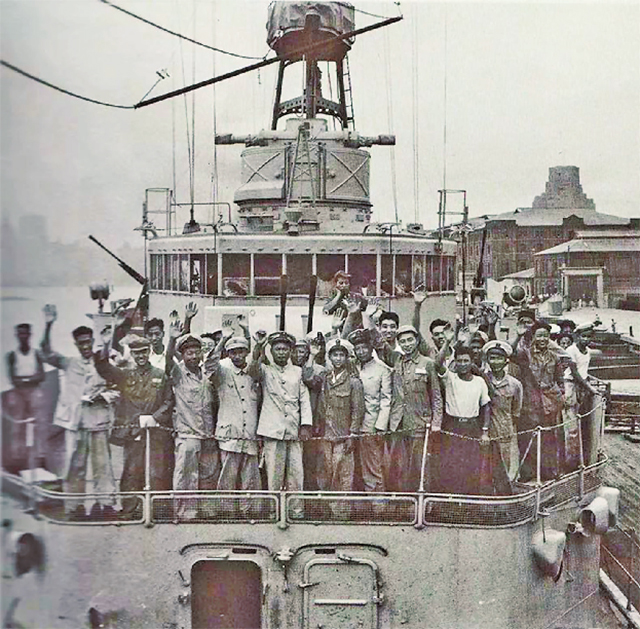 ▲国民党海军“长治”舰官兵起义后抵达上海。