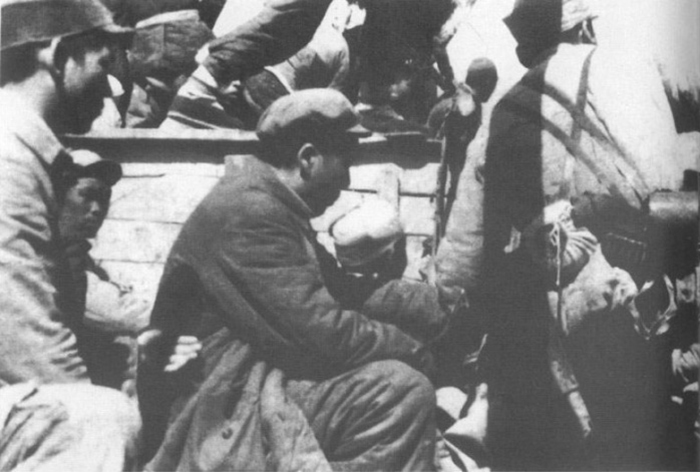▲1948年3月23日上午,毛泽东等中央前委负责人在陕西省吴堡县川口村园则塔渡口登船,准备东渡黄河。