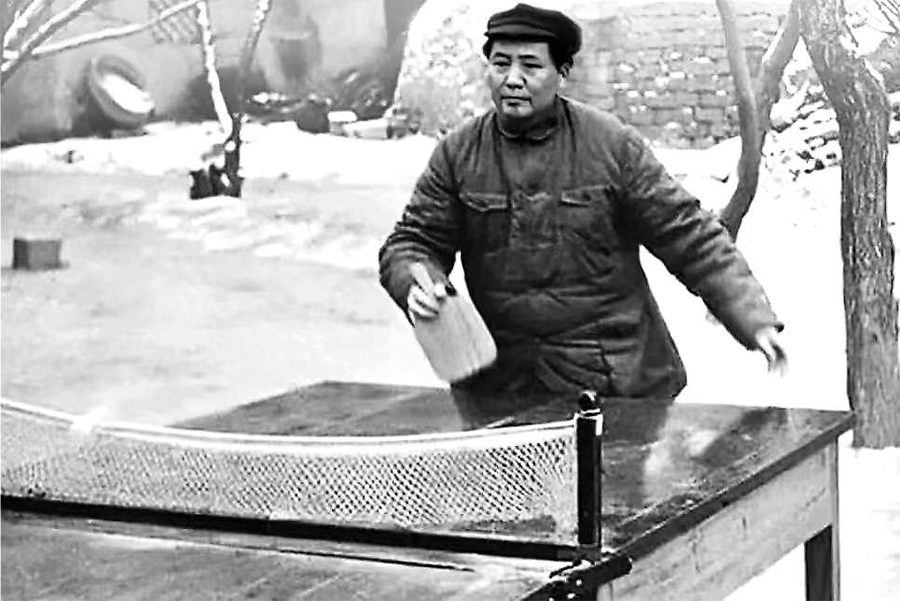 从这幅黑白的图片中,我们看到雪地里,简易的乒乓球桌,略微粗糙的光板乒乓球拍,丝毫没有减弱毛泽东左推右攻打球的热情和专注。这一幕,穿越了时空,在中国体育史册上留下了深刻的印记。