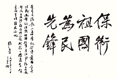 ▲1942年1月,邹韬奋从香港脱险后,在白石龙题词:“保卫祖国 为民先锋”。 资料照片