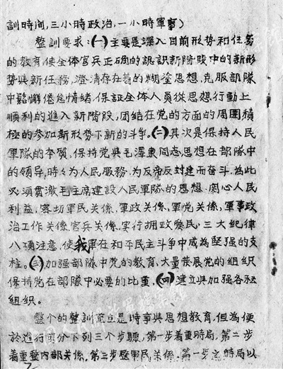 军区第2纵队坚决落实有关要求,于2月28日颁布纵队《关于三个月的政治整训训令》(以下简称《训令》)。这份诞生于革命战争年代的档案,开篇直指政治整训的目标和重点:“为了保证我军在新的形势和新的任务下,适应新的要求,负担着新的使命……把整个的重点放在时事和思想教育上面。”