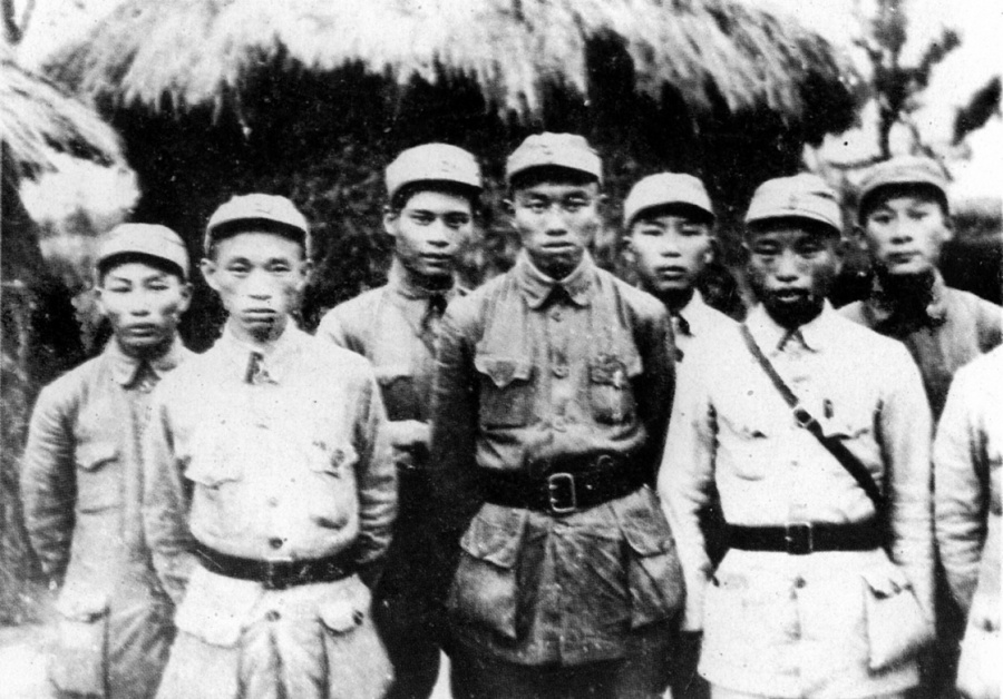 ▲这是1939年初,新四军第一支队二团部分干部在茅山的合影。左起第五位为萧国生。 新华社发(资料照片)