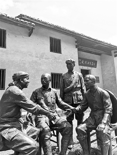 ▲中华苏维埃共和国最高法院旧址前的一座雕像,展现了何叔衡调解群众矛盾的场景。 江西瑞金干部学院供图