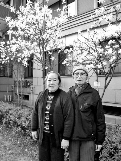 ▲王运熙(右)和夫人在玉兰树旁。
