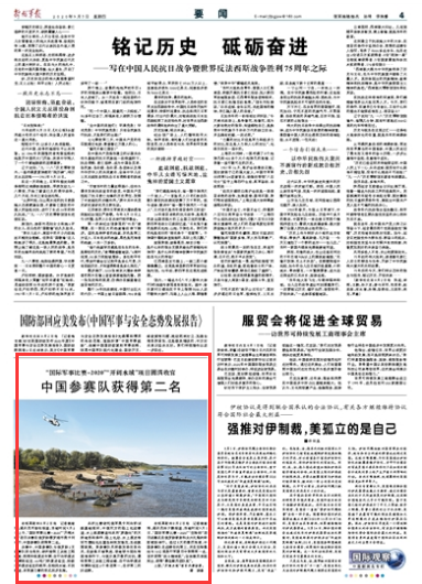 解放军报莫斯科9月2日电 记者赖瑜鸿、通讯员刘奎钊报道:当地时间9月2日上午,“国际军事比赛-2020”“开阔水域”项目决赛在俄罗斯穆罗姆市奥卡河举行,中国参赛队获得第二名。
