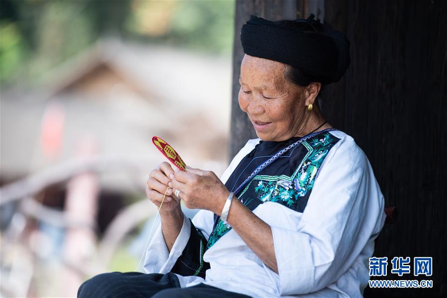 湖南花垣县十八洞村老人龙德晒正在自家门口为儿女们绣鞋垫(2019年9月30日摄)。新华社记者 陈思汗 摄