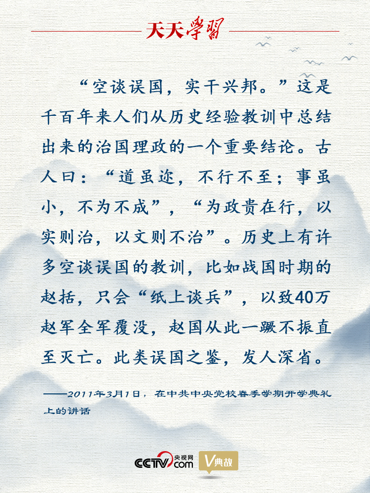 反对空谈、强调实干、注重落实,是我们党的优良传统,也是我们党能够在革命、建设和改革中不断带领人民夺取新胜利的关键。2011年在中央党校春季学期开学典礼上,习近平同志强调,我们的所有成就,都是干出来的。这里的关键,就是始终注重抓落实。如果落实工作抓得不好,再好的方针、政策、措施也会落空,再伟大的目标任务也实现不了。为此,他用“以实则治,以文则不治”这句古语以及“纸上谈兵”的故事加以阐明。
