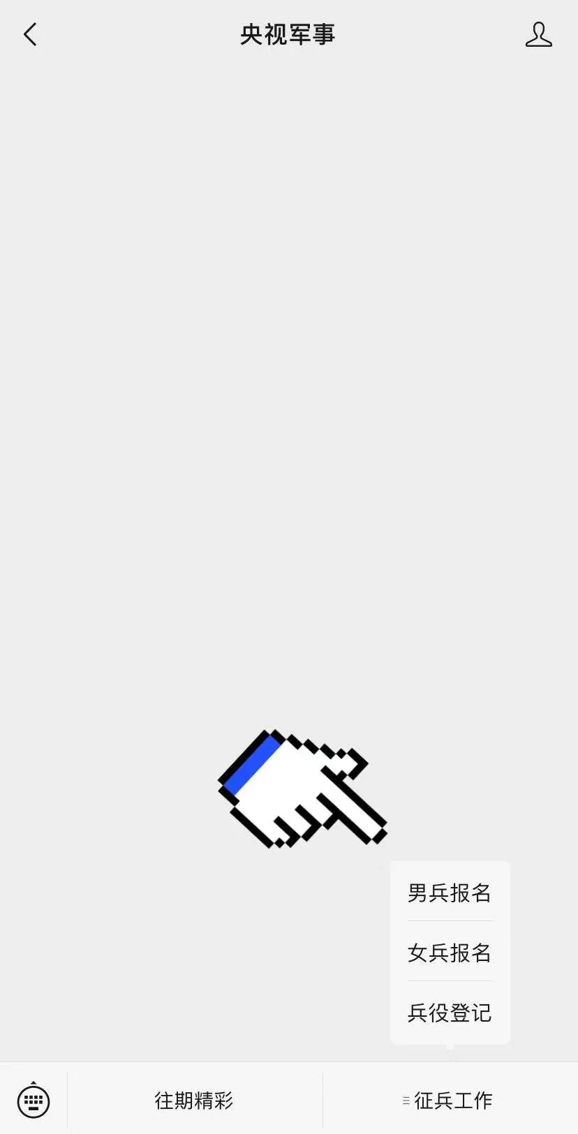 方式二:关注央视军事微信公众号,点击右下方“征兵工作”,同样可以直通报名页面。