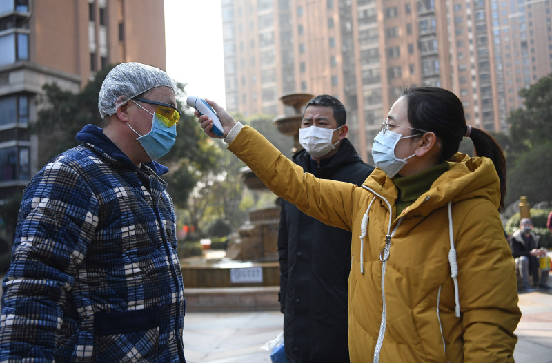 △2020年1月31日,在江西省南昌市西湖区一社区门口,一位青年街道干部(右一)为居民测量体温。