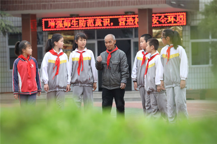 图为闫青海(中)给孩子们讲述西柏坡红色故事 2019年4月8日 梁子栋摄
