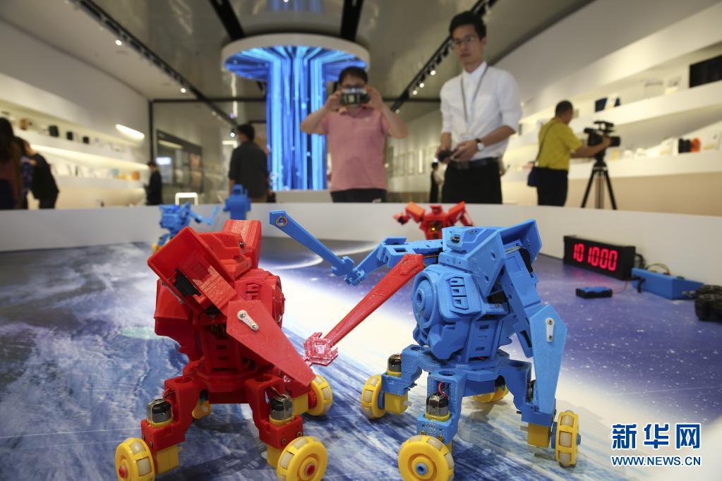 在广东工业设计城创新科技馆,工作人员在展示机器人“速斗无人区”(4月19日摄)。新华社记者 殷刚 摄