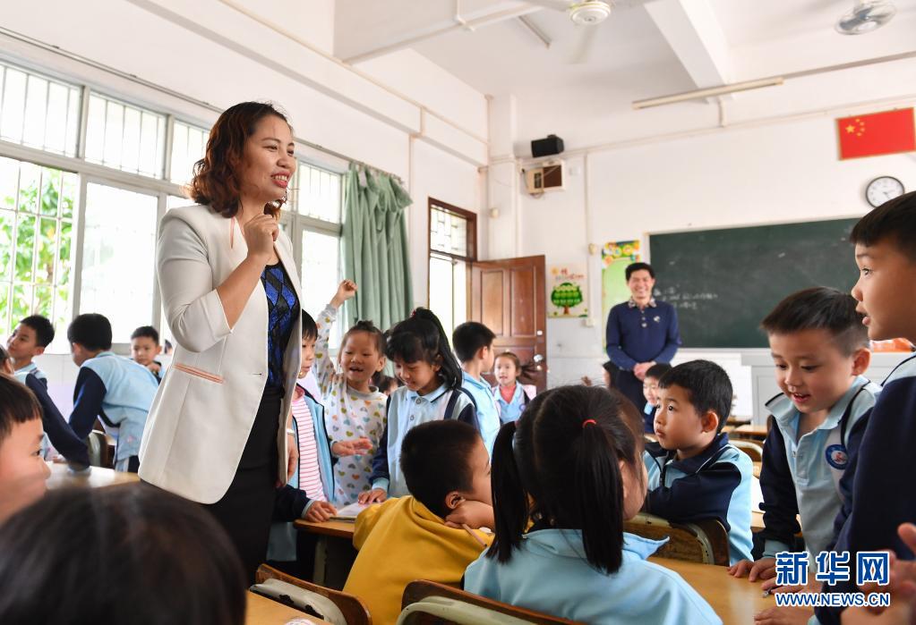 2019年2月20日,米雪梅(左)在中山市沙溪镇虎逊小学调研时与小学生交流。新华社记者 刘大伟 摄
