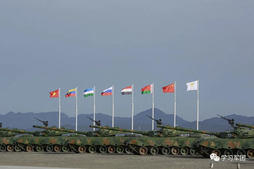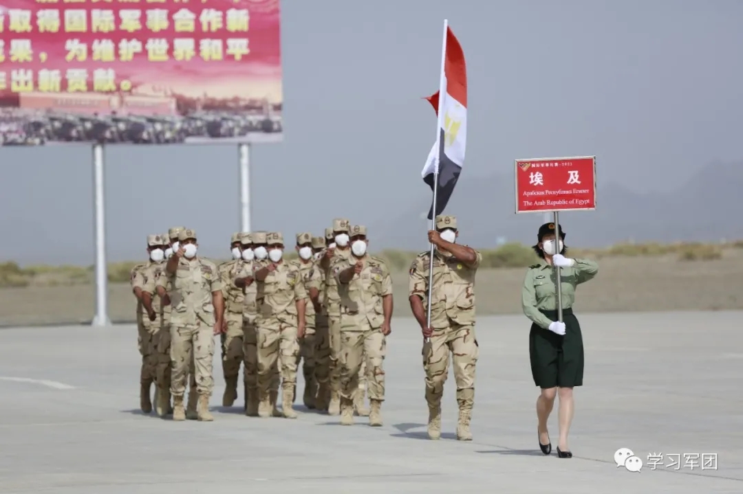 旌旗迎风招展,和平友谊同筑。白俄罗斯、埃及、俄罗斯、乌兹别克斯坦、委内瑞拉、越南参赛代表队依次入场。当一面面不同国家的国旗通过观礼台时,现场官兵热烈鼓掌,对远道而来的参赛队员表示欢迎。东道主中国参赛代表队最后一个入场,参赛队员们军容严整、精神抖擞,在五星红旗引领下通过观礼台。