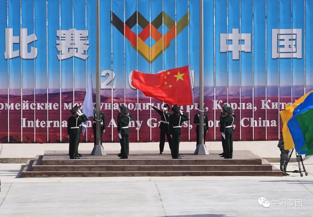 升旗仪式开始,首先升中华人民共和国国旗,伴随着《义勇军进行曲》,五星红旗冉冉升起,全场人员庄严行礼。紧接着,《胜利号角》乐曲奏响,国际军事比赛会旗缓缓升起。巴音郭楞蒙古自治州党委书记任广鹏和陆军办赛领导小组副组长、中部战区陆军少将副司令员朱晓辉分别致辞,陆军办赛领导小组组长、陆军中将副司令员刘发庆宣布比赛开幕。