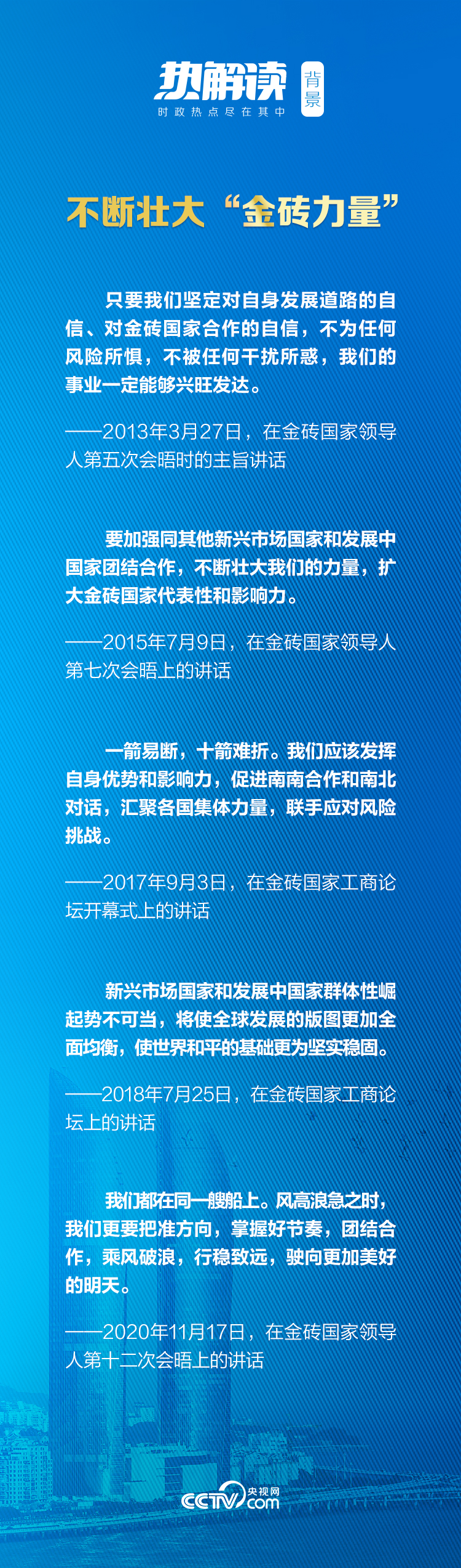 2013年至今,习主席在金砖国家领导人会晤上发表了一系列重要讲话,为金砖国家合作提出中国倡议、注入中国信心、增添中国力量。