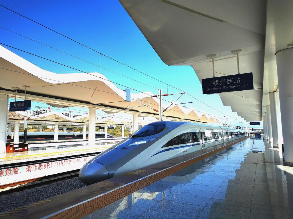 11月27日,深圳北至赣州西的满图试验列车停靠赣州西站。当天,赣深高铁全线满图试运行。新华社发(廖国胜摄)