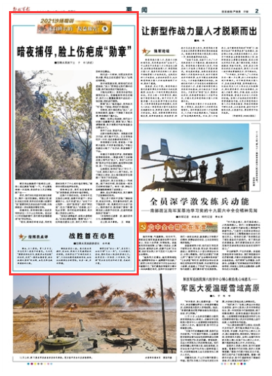 “脸上多个疤你不后悔?”演练结束,有战友问我。我笑着告诉他们,跳下陡坡那一刻,我真把对方当成了敌人。既然是打仗,脸划破了算啥?圆满完成上级授予的任务,这道伤疤就是我的“勋章”!