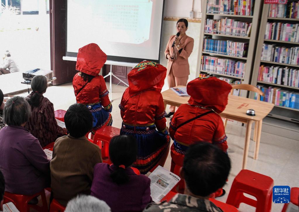 2021年11月19日,在广西钦州市钦北区大寺镇那布村农家书屋,宣讲员向村民宣讲十九届六中全会精神。新华社记者 张爱林 摄