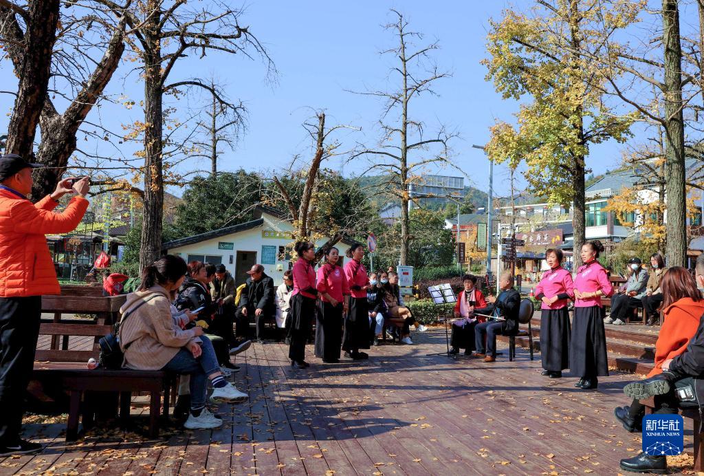 2021年11月25日,在浙江省湖州市长兴县小浦镇方一村,戏曲爱好者将六中全会精神融入戏曲,自编自导自演地方特色滩簧戏。新华社记者 徐昱 摄