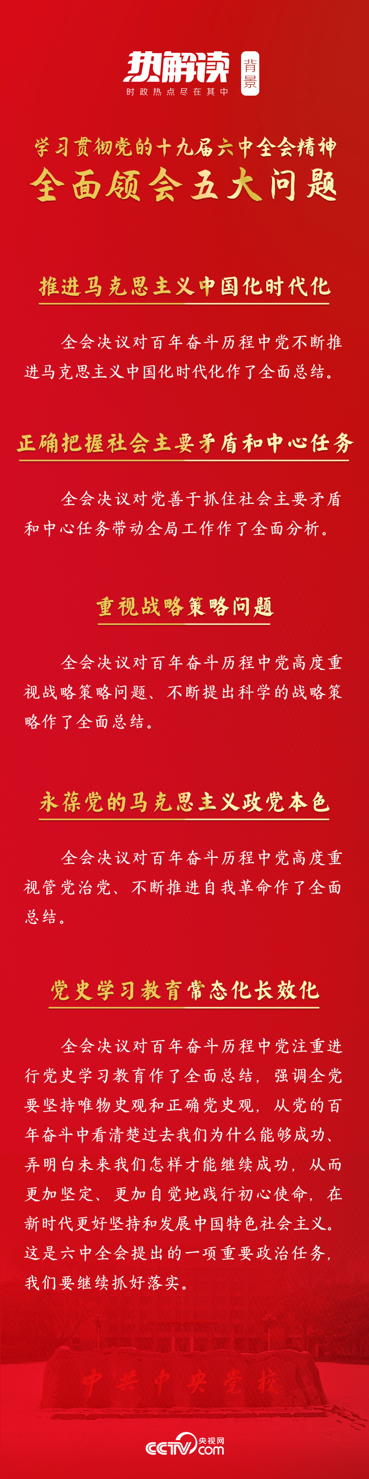 围绕“学习贯彻党的十九届六中全会精神”这个主题,总书记深入阐述了五大重要问题。首要问题便是推进马克思主义中国化时代化。