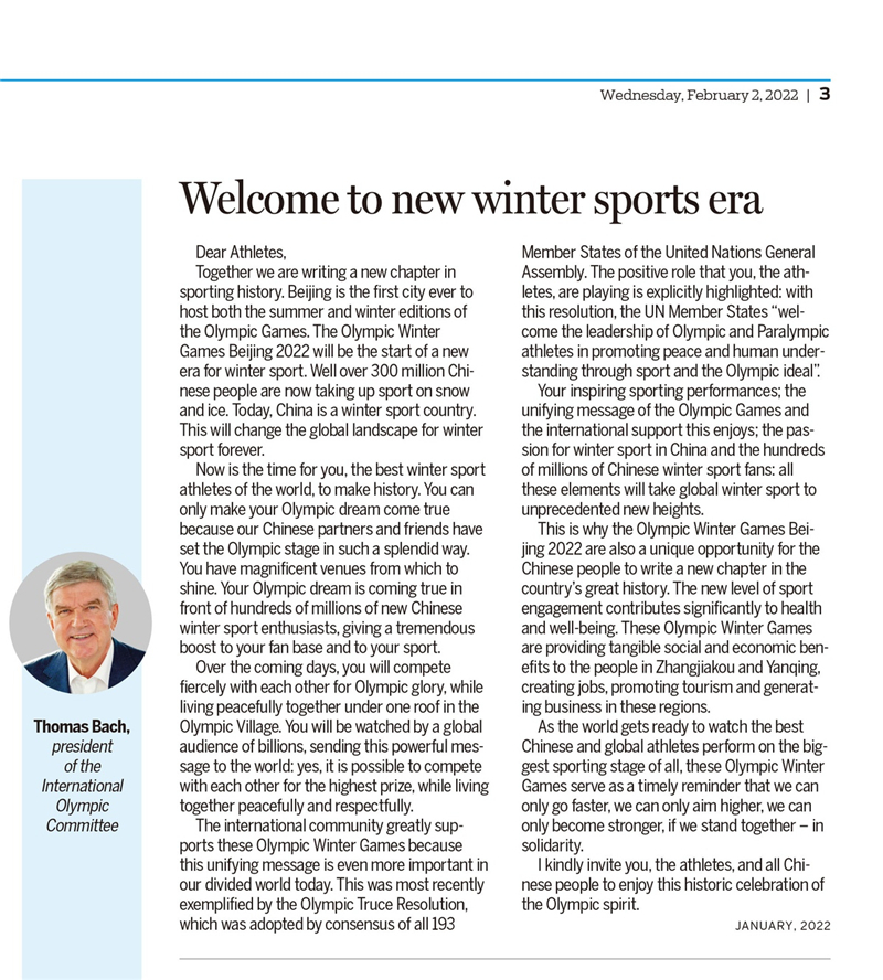 国际奥委会主席巴赫致信冬奥会刊:欢迎来到冰雪运动新时代